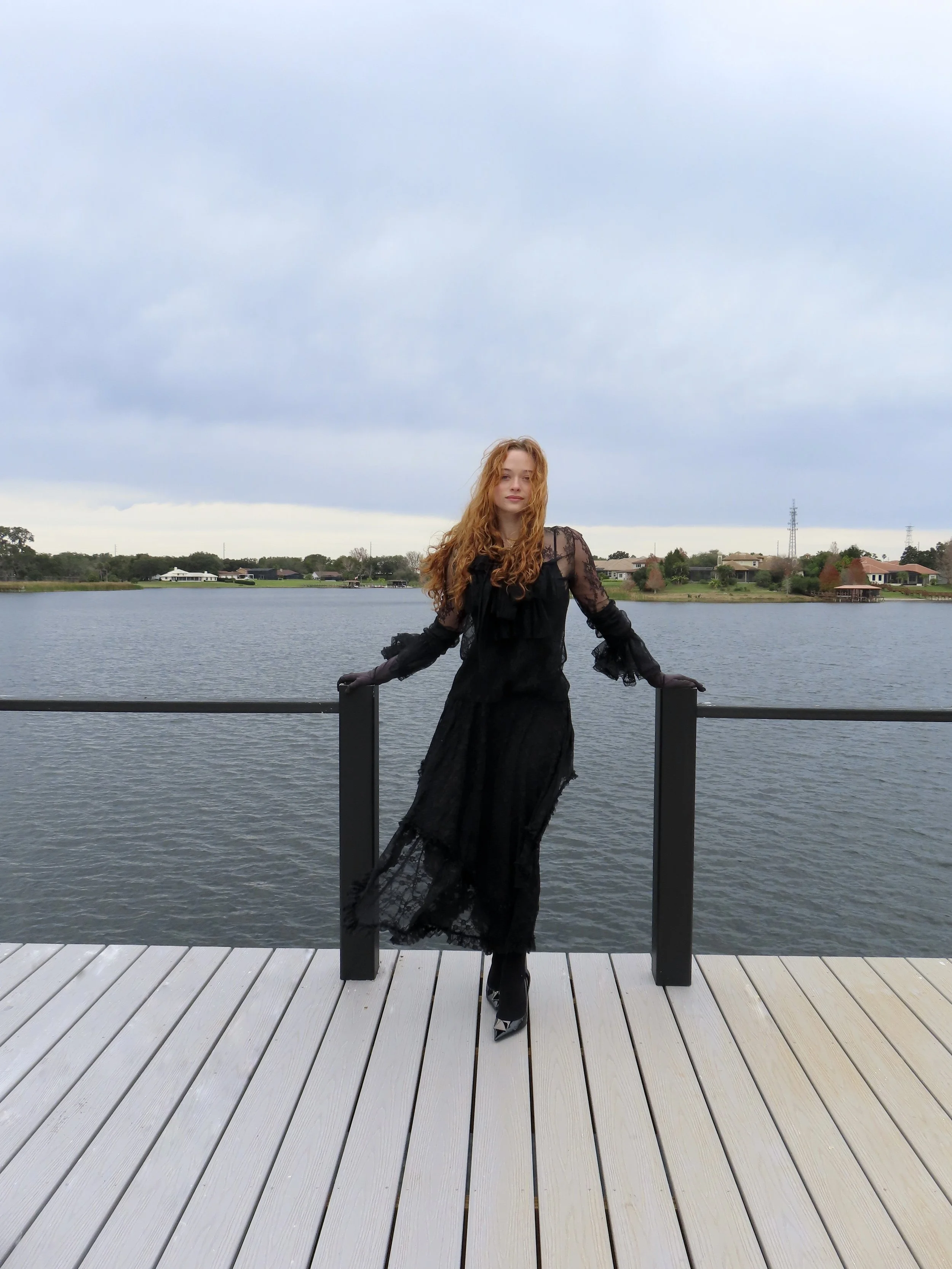 The top is a black-lace blouse with a tie and flared sleeves from Zara. I purchased it in 2022, but if you search “lace black top” you should see some similar styles.